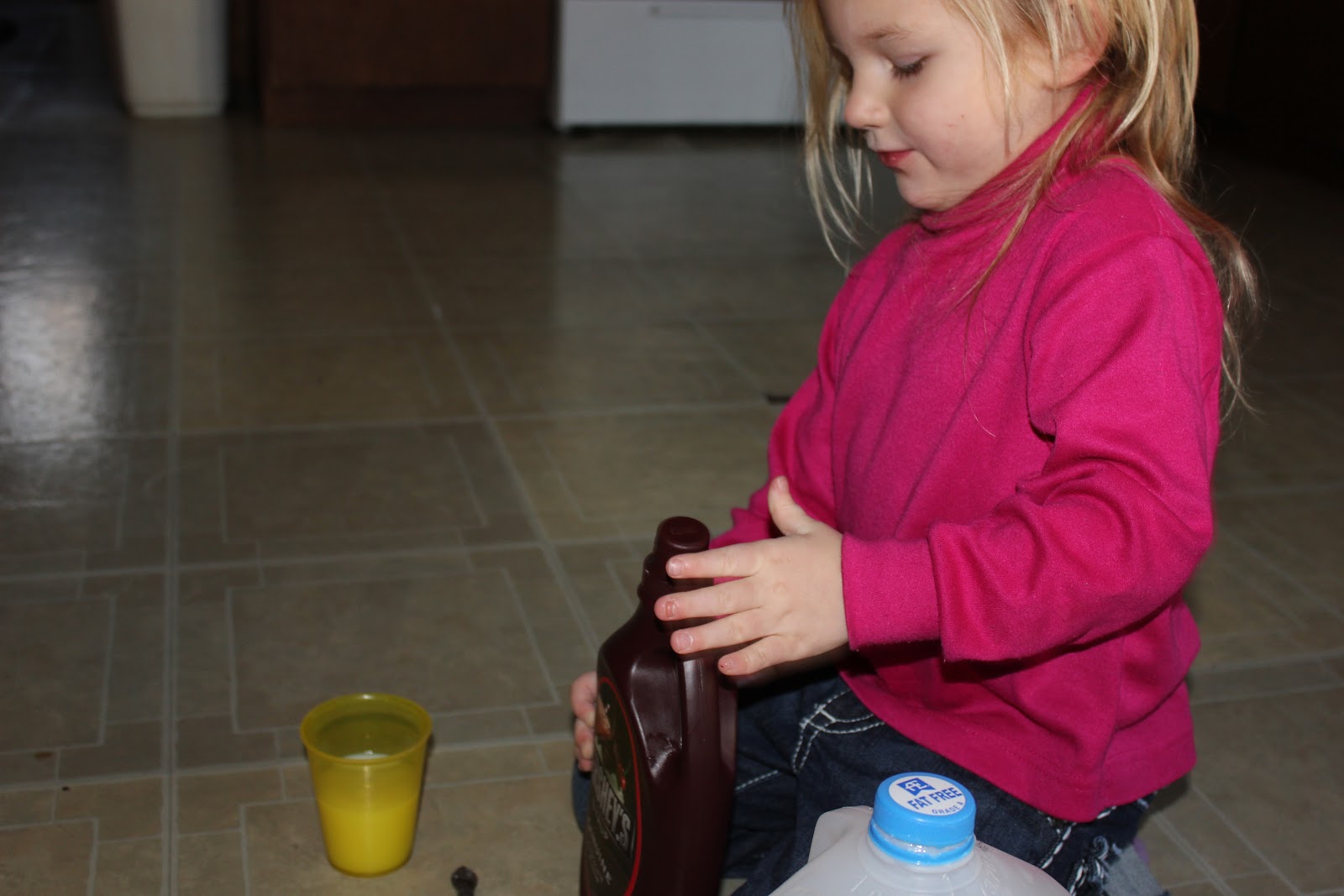 Rylin has been all about being a big girl. So the other day while the kids were in school she wanted chocolate milk and the milk jug was almost empty. I was feeling nice (or crazy however you look at it) and decided to teach her how to do it on her own.(With supervision only!) She was SO excited!